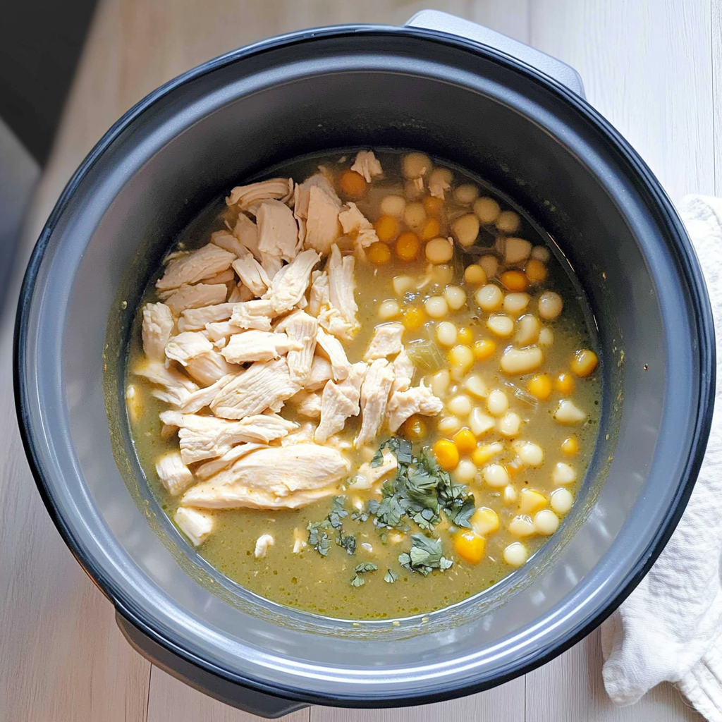 Instant Pot Method – Pressure cook chicken, broth, green enchilada sauce, and chiles for 10 minutes; add cheeses after releasing pressure.