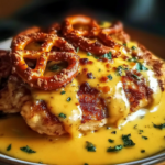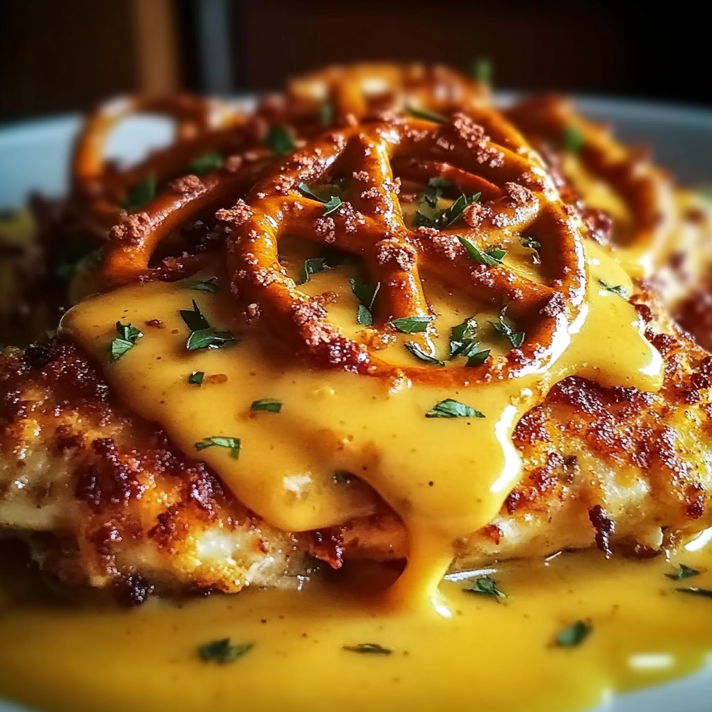 If you love bold flavor and crunchy texture, Pretzel Chicken with Mustard-Cheddar Sauce deserves a spot on your dinner table. This dish takes simple chicken breasts and turns them into something special by coating them in crushed pretzels, then baking them until golden and crisp. The real magic happens when that crunchy chicken meets a warm, creamy mustard-cheddar sauce that melts right over the top.